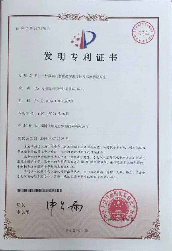 經(jīng)過兩年半的時間,《一種微功耗智能數(shù)字溫度計及溫度測量方法》通過審核,獲得國家發(fā)明專利證書,填補了我公司國家發(fā)明專利的空白,標(biāo)志著我公司研發(fā)水平上了一個新臺階,向發(fā)明人刁國榮等表示熱烈祝賀! 截止到目前,飛雁先行公司共獲得一個國家發(fā)明專利,38個實用新型專利,2個外觀專利,專利數(shù)量和質(zhì)量在同行業(yè)中遙遙領(lǐng)先。