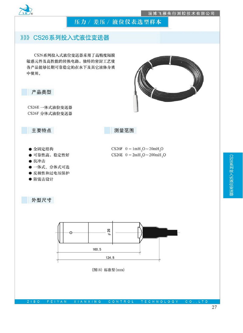 CS26系列投入式液位變送器采用了高精度隔膜敏感元件及高性能的轉(zhuǎn)換電路,獨特的密封工藝使各產(chǎn)品能夠長期可靠穩(wěn)定的在水下及其它液體介質(zhì)中使用。