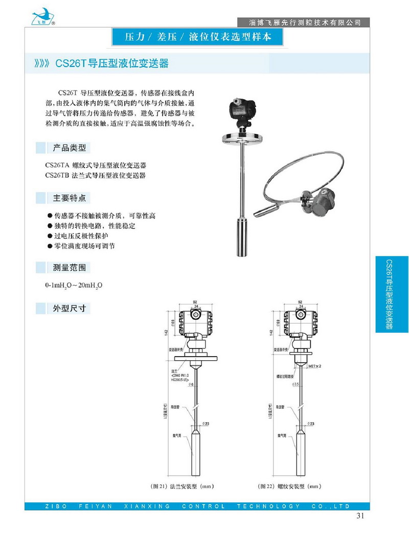 CS26T導(dǎo)壓型液位變送器,傳感器在接線盒內(nèi)部,由投入液體內(nèi)的集氣筒內(nèi)的氣體與介質(zhì)接觸,通過(guò)導(dǎo)氣管將壓力傳遞給傳感器,避免了傳感器與被檢測(cè)介質(zhì)的直接接觸,適應(yīng)于高溫強(qiáng)腐蝕性等場(chǎng)合。