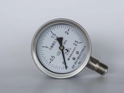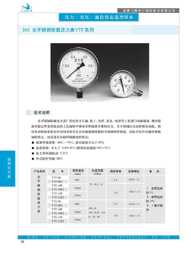 全不銹鋼防腐壓力表廣泛應(yīng)用于石油、化工、化纖、冶金、電站等工業(yè)部門對耐腐蝕、測量精度和穩(wěn)定性要求較高的工藝流程中測量各種流體介質(zhì)的壓力。全不銹鋼壓力表的測量系統(tǒng)、指針傳動機構(gòu)及儀表外殼均采用具有良好耐腐蝕性能的不銹鋼材料制成,因此不僅具有耐介質(zhì)腐蝕的特點,而且還具有耐環(huán)境腐蝕的特點; 使用環(huán)境條件:-40℃~+70℃,相對濕度不大于85% 溫度影響:不大于0.4%/10℃(使用溫度偏離20℃±5℃) 抗工作環(huán)境振動:V.H.3 外殼防護等級:IP63