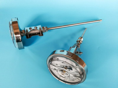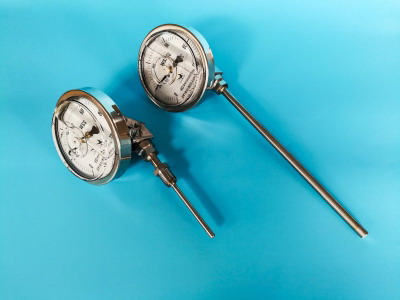 電接點雙金屬溫度計則在結(jié)構(gòu)上增添了電接觸組,調(diào)節(jié)裝置和出線盒等部件。在溫度變化時,當與預先設定的控溫定觸點(上限或下限)相接觸或斷開的瞬間,使控制線路中的繼電器或接觸器動作,從而實現(xiàn)了自動控溫或報警的功能。