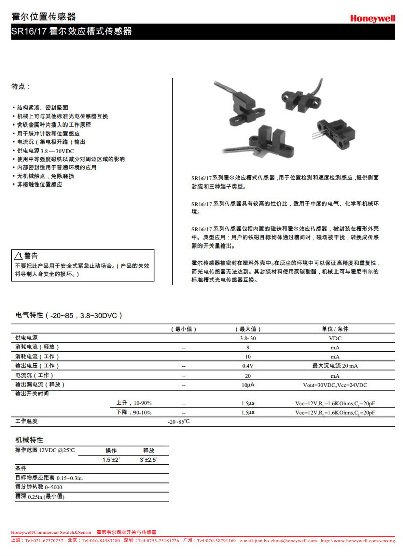 SR16/17系列霍爾效應(yīng)槽式傳感器,用于位置檢測和速度檢測感應(yīng),提供側(cè)面封裝和三種端子類型。 SR16/17系列傳感器具有較高的性價比,適用于中度的電氣、化學和機械環(huán)境。 SR16/17系列傳感器包括內(nèi)置的磁鐵和霍爾效應(yīng)傳感器,被封裝在槽形外殼中。典型應(yīng)用:用戶的鐵磁目標物體通過槽間時,磁場被干擾,轉(zhuǎn)換成傳感器的開關(guān)量輸出。 霍爾傳感器被密封在塑料外殼中。在頂塵的環(huán)境中可以保證精度和重復(fù)性,而光電傳感器無法達到。其封裝材料使用聚碳酸酯,機械上與霍尼韋爾的標準槽式光電傳感器互換。