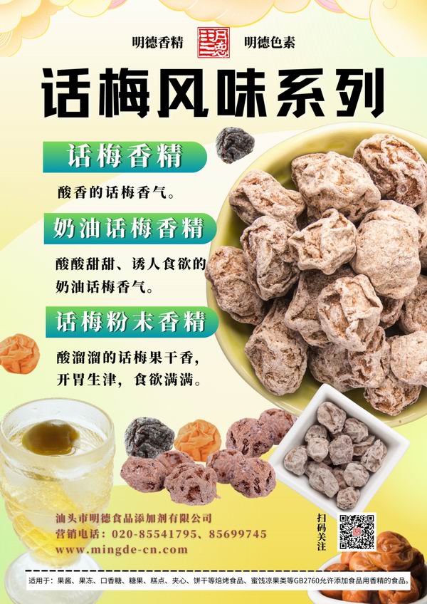 在梅子風(fēng)味香精領(lǐng)域我們數(shù)十年潛心專研,迎合市場需求,滿足消費(fèi)者喜好,汕頭市明德食品添加劑有限公司,推出了多種款梅子風(fēng)味香精,如:青梅風(fēng)味、酸梅風(fēng)味、話梅風(fēng)味、酸梅湯風(fēng)味等。