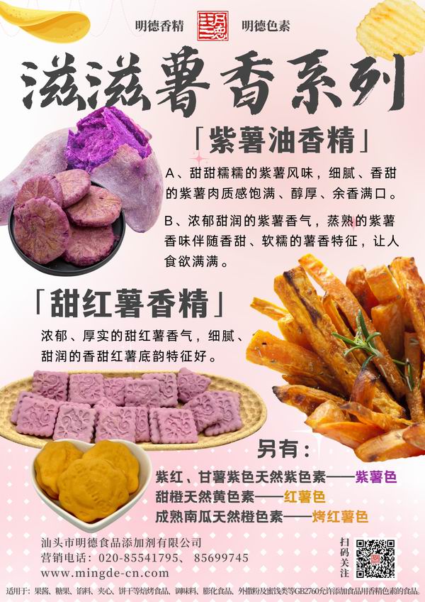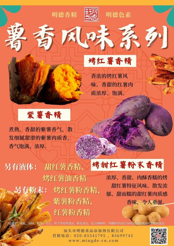 在薯味香精領(lǐng)域我們數(shù)十年潛心專研,迎合市場需求,滿足消費(fèi)者喜好,汕頭市明德食品添加劑有限公司,推出了多種風(fēng)味的番薯風(fēng)味香精,如:紫薯香精、紅薯香精、烤紫薯香精、烤紅薯香精、甜紅薯香精等。